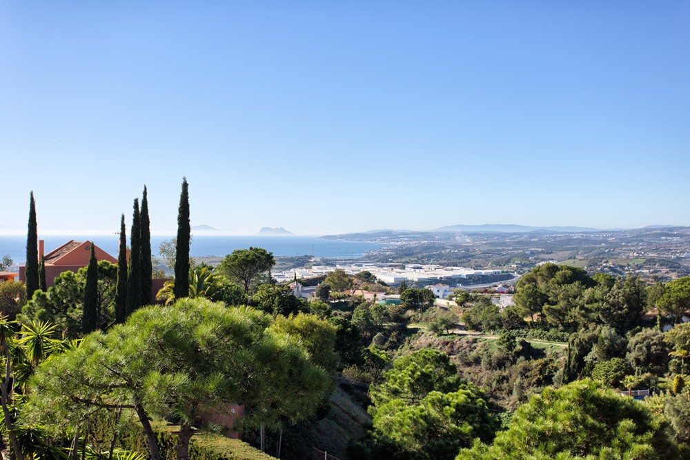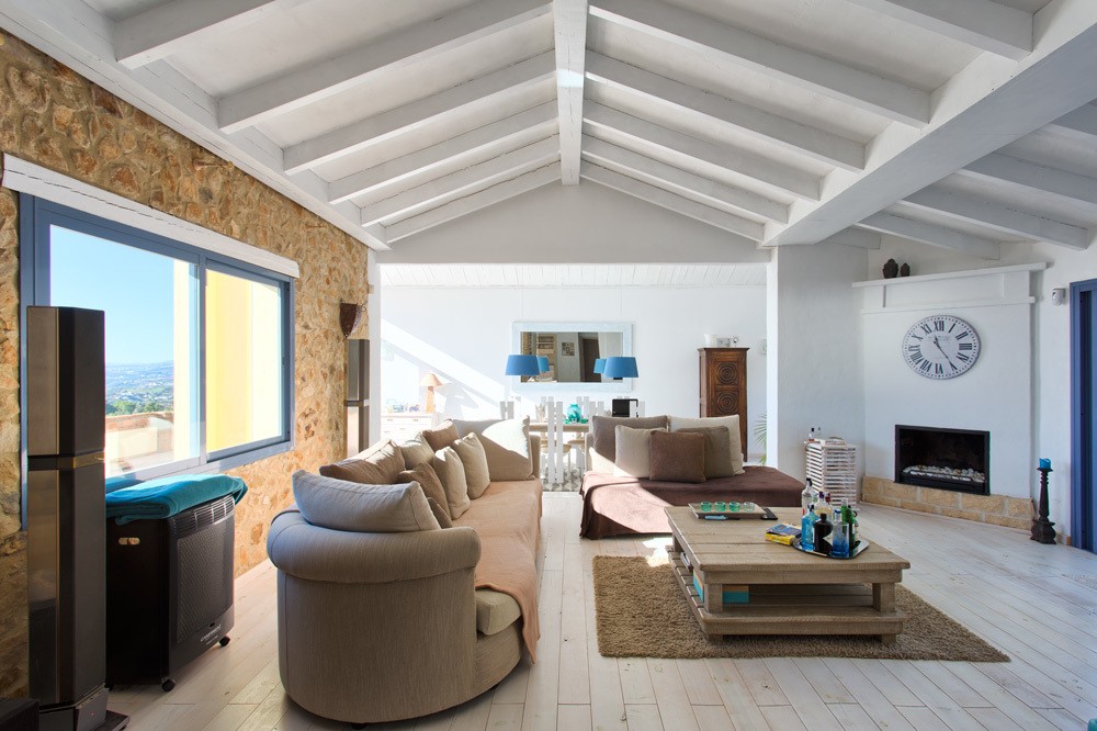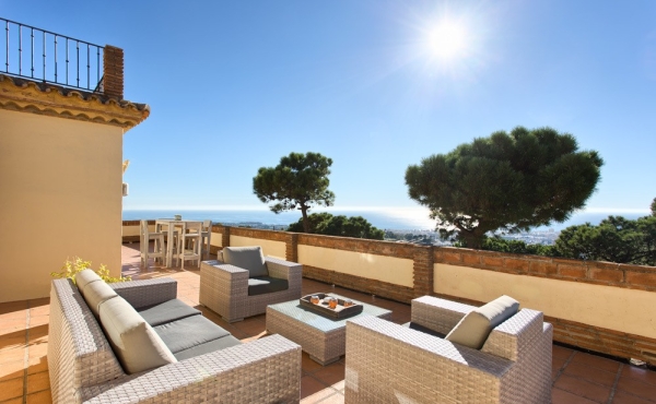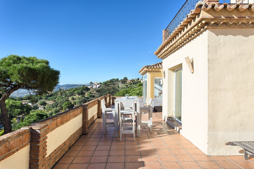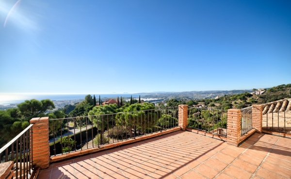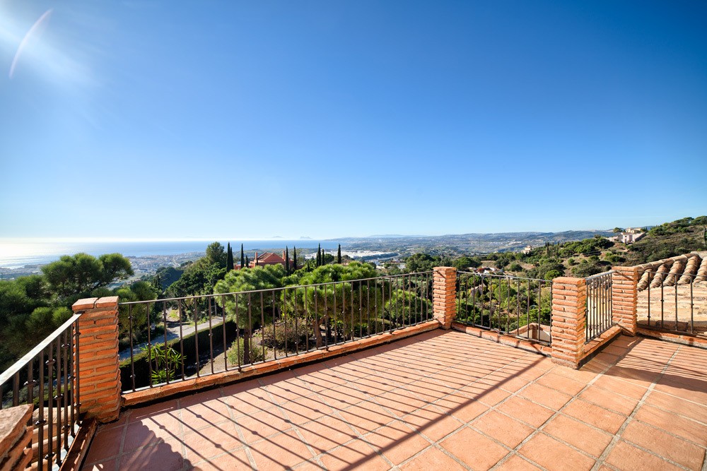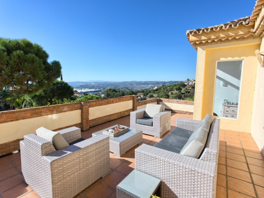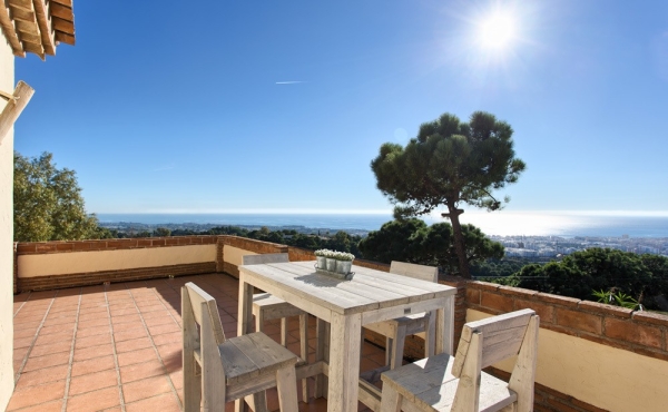 The villa is located in Puerta de los Reales, a peaceful area of Estepona high up the mountain yet just 3 km from the town giving you easy access to amenities, restaurants and beaches within minutes. Its' elevated position of 166 meters above sea level offers breathtakingly beautiful panoramic 180-degree views over Estepona and to the sea which can be enjoyed from both inside and outside on the large south facing terrace. Built in a rustic style with modern interiors the property offers plenty of space over three levels: