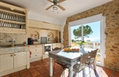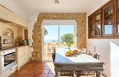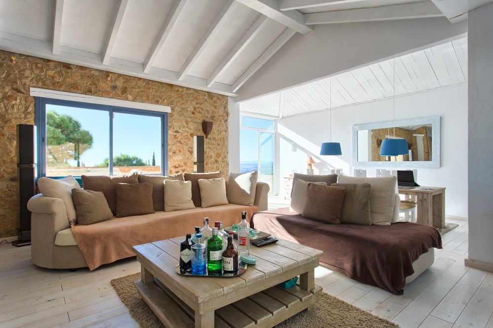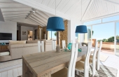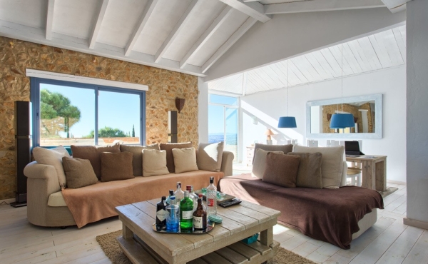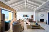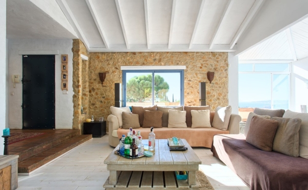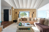 Main Floor - Spacious living area with fireplace, fully fitted kitchen with quality Siemens appliances that open out to a large front terrace with sea views, two bedrooms and one bathroom.