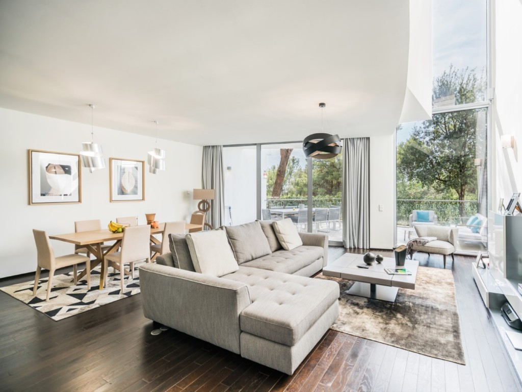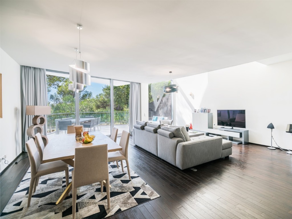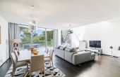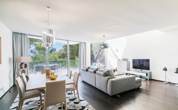 An open plan living area with panoramic glass doors which combines a lounge and a dining area.
