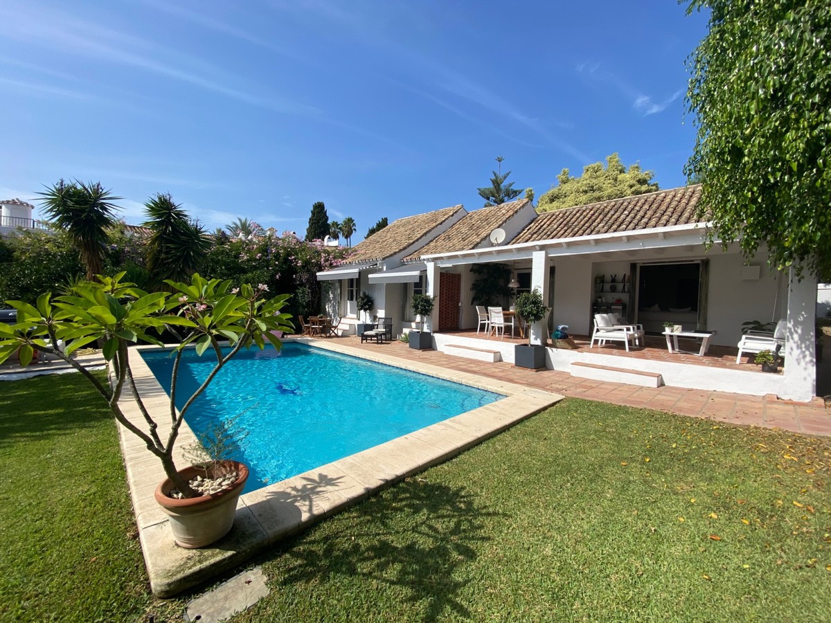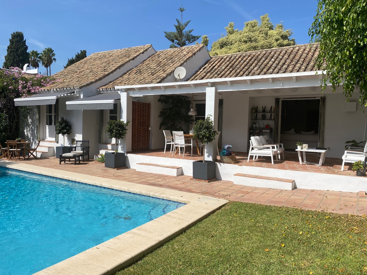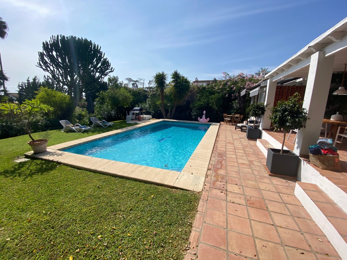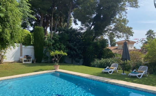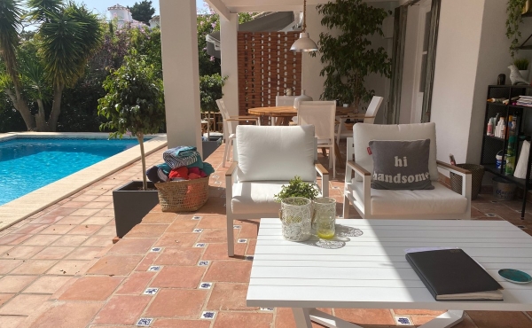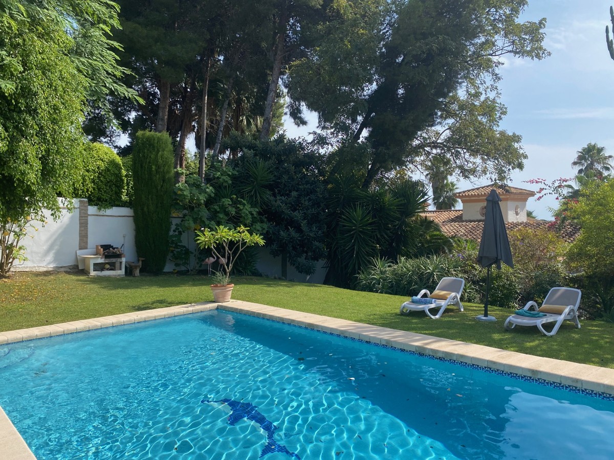 A charming villa located in a quiet cul-de-sac in El Paraiso, Estepona within walking distance to shops, restaurants, bars and the beach. The property was renovated in 2021 and consists of one floor, there is a spacious living/dining area with high beamed ceilings, fireplace and direct access out to the terrace; a modern fully fitted kitchen; 4 bedrooms and 3 bathrooms (two of the bedrooms are en-suite and the master bedroom has a dressing area). Outside the large garden is laid to lawn and surrounded by trees and shrubs providing plenty of privacy, there is a covered terrace for dining al fresco and a private pool measuring 9 x 4.5 meters. This villa also comes with the added bonus of 35 m² garage with parking space for 2 cars.