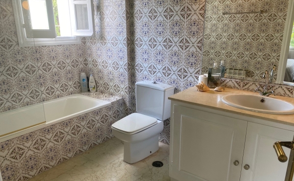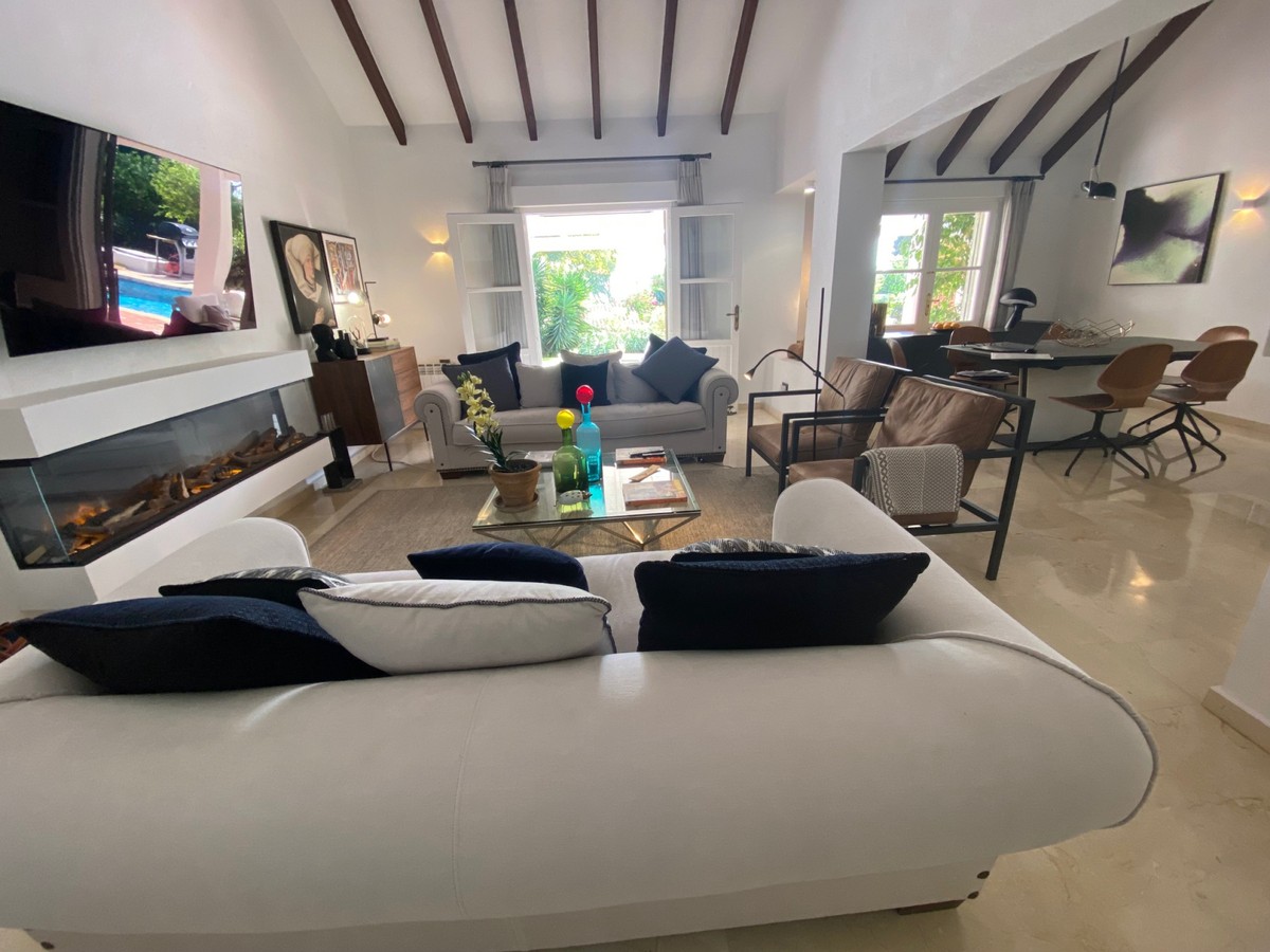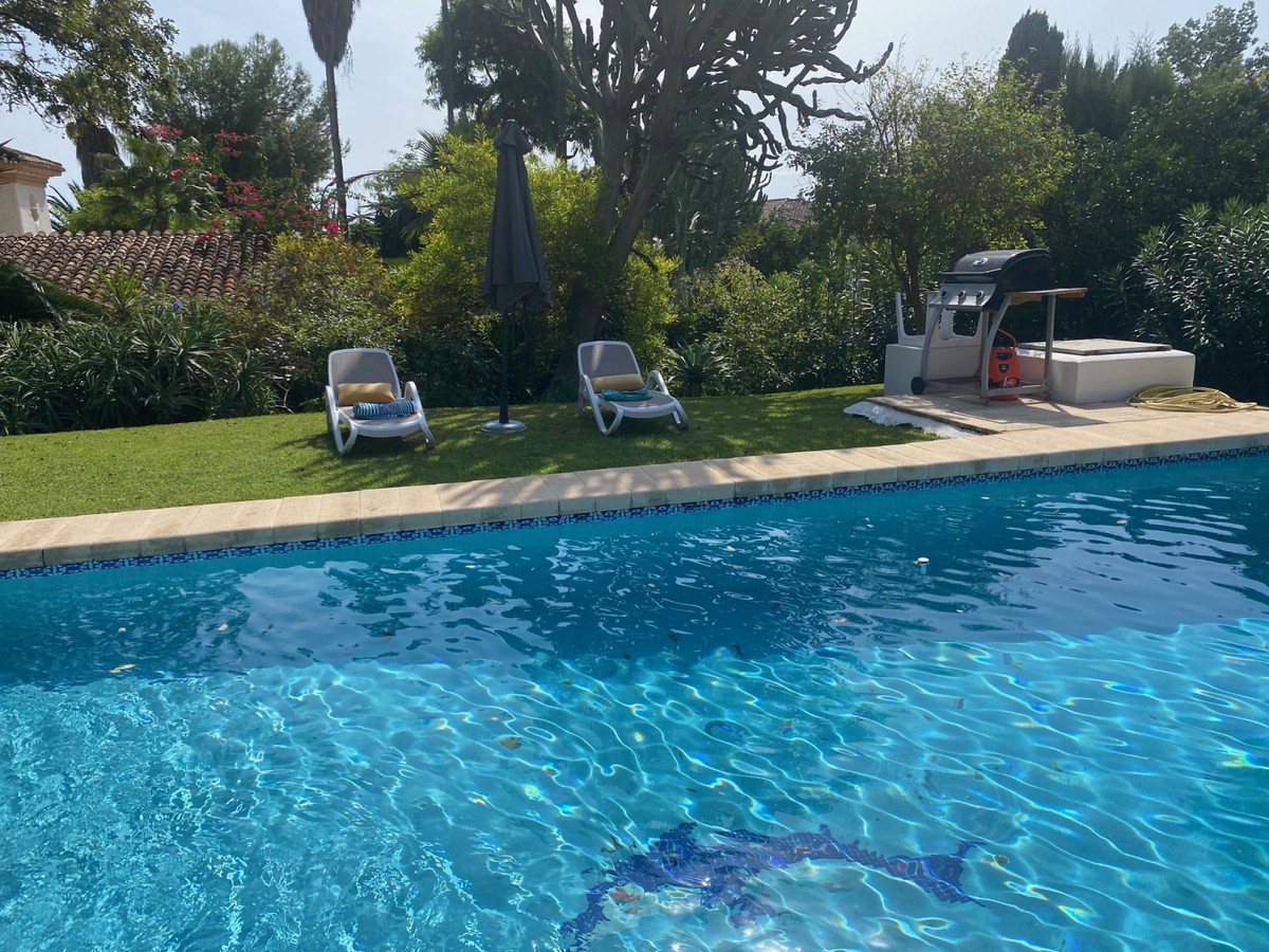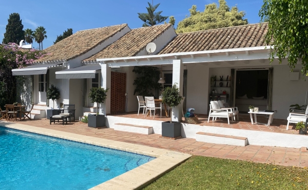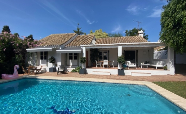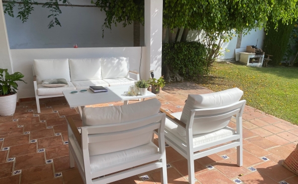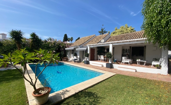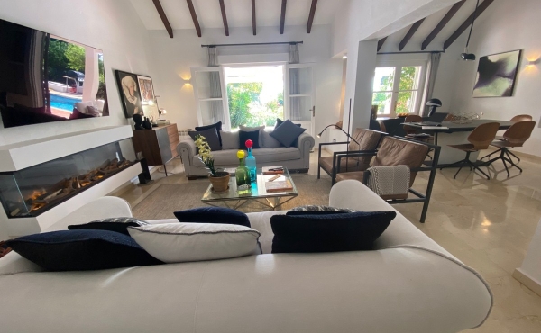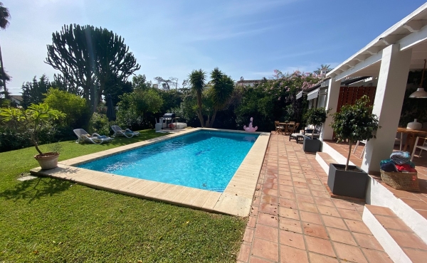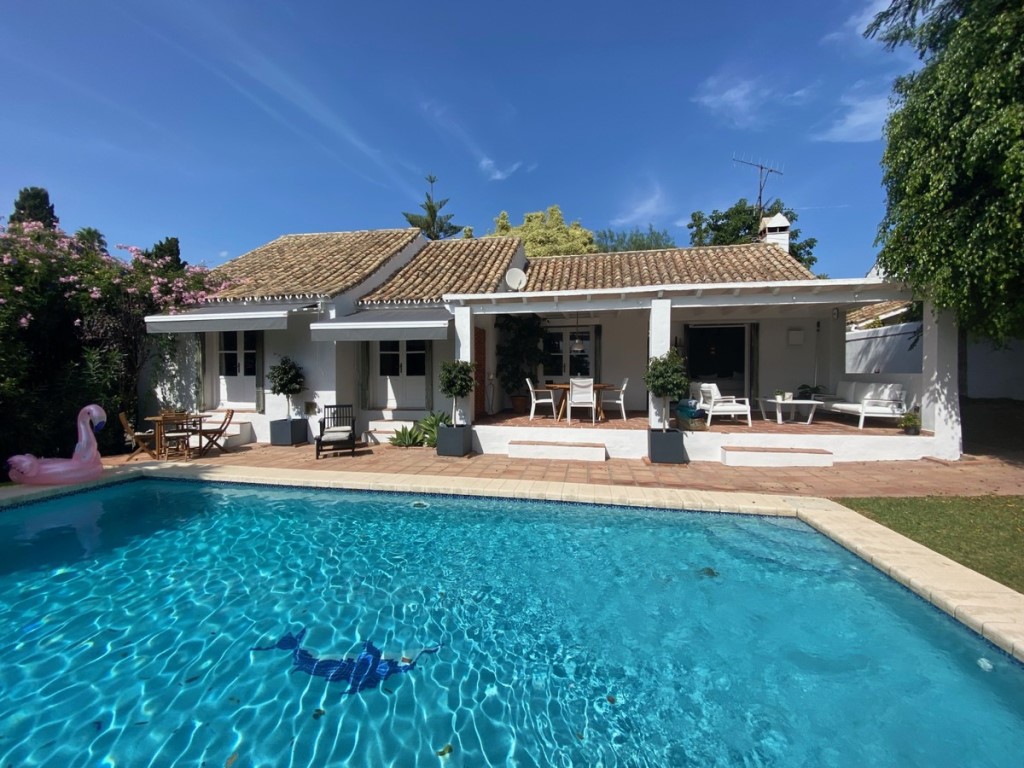 A charming villa located in a quiet cul-de-sac in El Paraiso, Estepona within walking distance to shops, restaurants, bars and the beach. The property was renovated in 2021 and consists of one floor, there is a spacious living/dining area with high beamed ceilings, fireplace and direct access out to the terrace; a modern fully fitted kitchen; 4 bedrooms and 3 bathrooms (two of the bedrooms are en-suite and the master bedroom has a dressing area). Outside the large garden is laid to lawn and surrounded by trees and shrubs providing plenty of privacy, there is a covered terrace for dining al fresco and a private pool measuring 9 x 4.5 meters. This villa also comes with the added bonus of 35 m² garage with parking space for 2 cars.