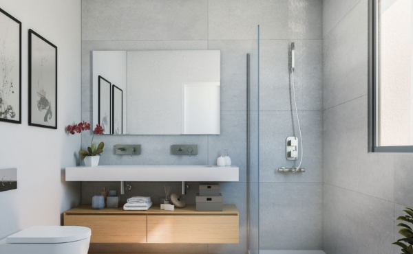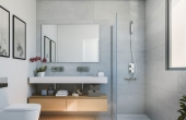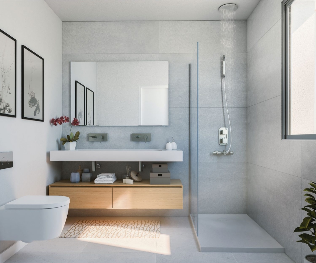 Elegant bathrooms with porcelain tiles, high end fixtures, fittings.